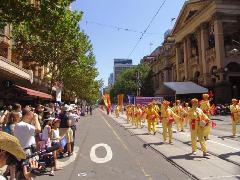 街道两旁挤满了观赏的民众,高达40度以上的炎热高温天气丝毫也没影响人们的热情,身穿黄色炼功服装的法轮功游行队伍吸引了众多市民观赏和拍照,也是当日游行队伍里最夺目整齐的队伍,走在队伍前面的三位小弟子拿着写着中英文“真、善、忍”的圆牌匾,跟着是学员手举中英文“法轮大法”大横幅,威震八方的腰鼓队更是吸引了市民和摄影记者的目光,然后是法轮大法旗帜、仙女、唐装服饰、花车和舞蹈等。游行队伍到达终点后,更有市民来找法轮功学员合照留念。