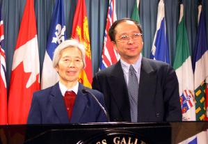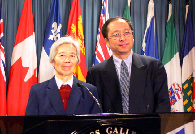 ![]() 黄代明(左)和加拿大法轮大法学会主席李迅(右)在新闻发布会上 |