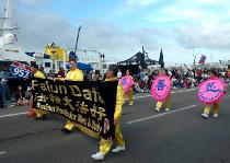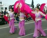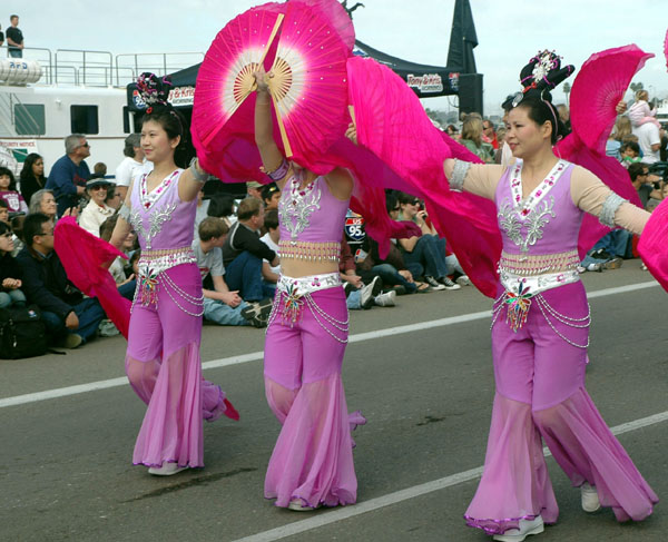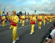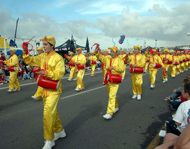 队伍沿滨海大道前進,从港口出发直到海港渔村(Seaport Village),沿途挤满了数以十万计的热情观众。游行由当地电视台直播,并向全美转播。在众多的游行队伍中,法轮功学员的腰鼓队和仙女队显得格外醒目。走在队伍最前面的是“法轮大法好”和“真、善、忍”的横幅,随后是排成三列纵队的腰鼓阵,腰鼓队员人人一身黄灿灿的炼功服,头戴黄头巾,腰挎红腰鼓,随着“法轮大法好”的乐曲,齐刷刷的打着鼓,面带微笑,一路威风凛凛走来,赢得观众真诚的叫好。跟在腰鼓阵之后的是美丽的仙女队,她们身着中国敦煌壁画里看到的那种飞天的服饰,头上是高高的发髻,随着音乐翩翩起舞。路边观众纷纷拿起照相机、摄像机抢拍镜头。