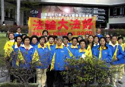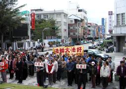 【明慧网2006年1月3日】台湾台东县2006年新年升旗典礼,除台东县府各单位首长员工外,也有许多团体及民众前来参加,队伍中最醒目的是“法轮大法好”的横幅。