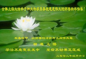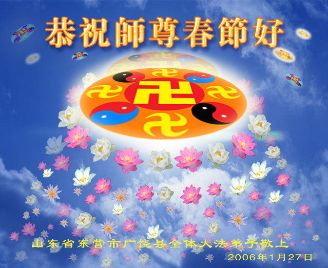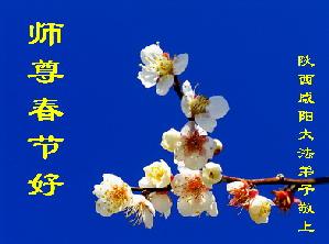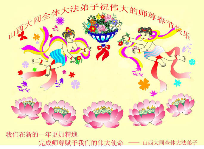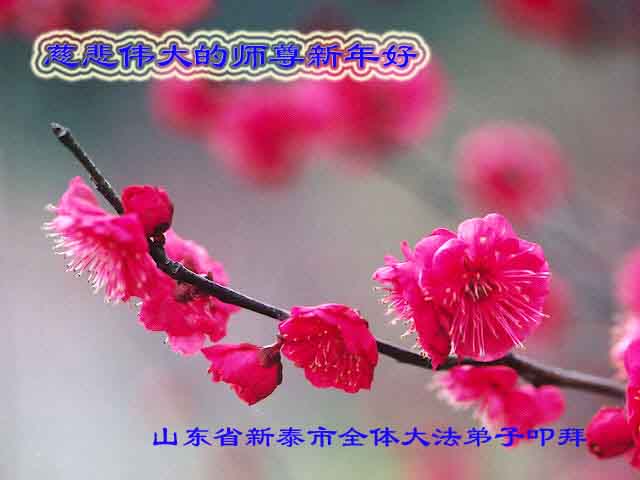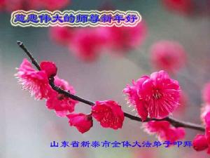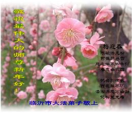 您好!在这新春佳节之际,我们曲阜的全体大法弟子向您问好,在您的慈悲呵护下,我们又走过了难忘的一年。在新的一年里,我们要时刻牢记您的教诲,加强整体协调,继续做好三件事,迎接在那春暖花开与师父相聚的美好时刻。