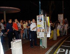 在半山观景台,我们向一辆辆大车小车载着的中国人播放法轮功真相影片,走了几车,紧接着又是几车。在寂静的夜里,只听到电视播出的真相影片,从江××如何迫害法轮功开始,每个在看的中国人都脸色凝重、悲凄,电视继续播着大法不被邪恶所阻,洪传全世界。伴随着优美的音乐,这时录像里播出了师尊讲法的那一幕,刹那间这些可贵的中国人脸上的表情,展露出希望、幸福的笑容,每当看到这一幕时我的心中常会很感动,因为他(她)们明白的那一面,终于见到了慈悲伟大的师父,当然心中的激动,是言语难以形容的。