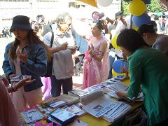 这天出了个大太阳,是一个晴朗的好天气。学员们早上七点半就到了会场开始布置,充了些气球,把写有“真、善、忍”的横幅打上,把亲手折叠的配上洪法书签的纸莲花挂在棚子上,播放“普度”音乐,黄色的布铺在桌上,上面放上日文、中文《转法轮》以及教功带等等。