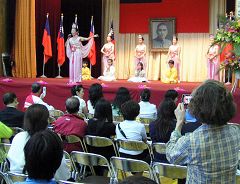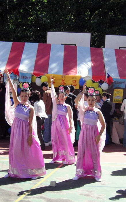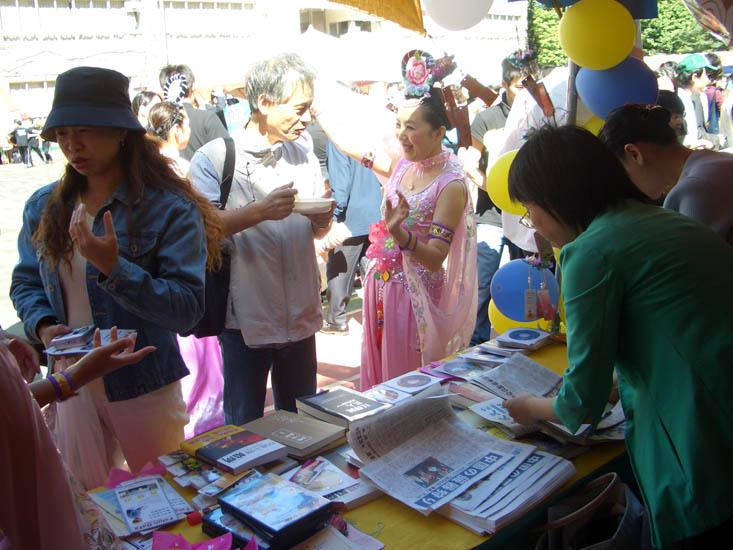 因为中午学员们要在小学校的礼堂里表演舞蹈,所以刚到不久,就一个接一个的换上了唐装。这样的打扮,不仅仅是对日本人,连台湾人也是很新鲜少见的。换好了唐装的学员们站在摊位前,吸引了很多人的注意,人们纷纷上前来要求合照。穿唐装的学员们无论是发传单的,面对面讲真相的,效果都很好,人们都接传单、也很认真的听。有两个小弟子则换上了黄色的炼功服演示五套功法,隔壁摊位的人们,看到这两个小弟子炼功,一直说“好可爱,好可爱”。