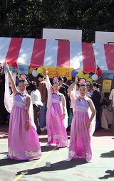 ![]() 游园会上,学员们向人们展示祥和的法轮功功法 |