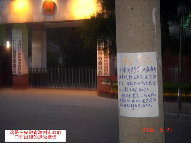 ![]() 安徽滁州市政府门前的退!党!消息 | ![]() 安徽蚌埠市科学宫附近的退!党!标语 |