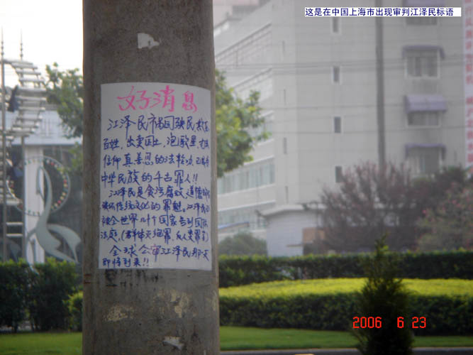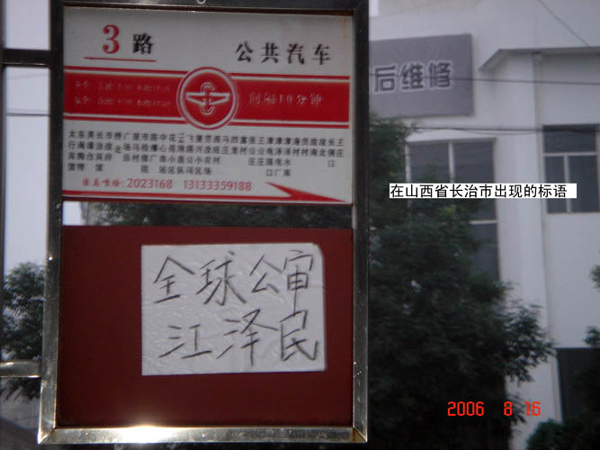 ![]() 上海市出现的审判江泽民标语 | ![]() 山西长治市出现的审判江泽民标语 |