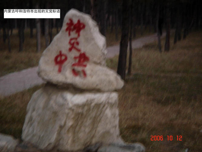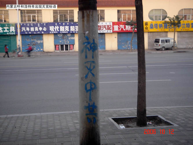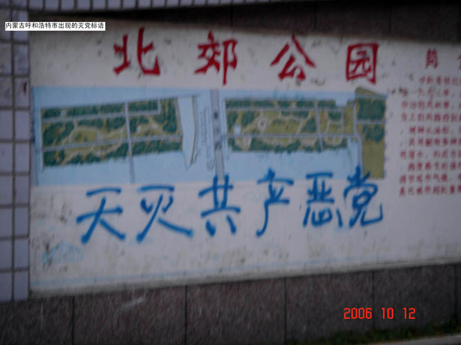 ![]() 内蒙古呼和浩特市的“天灭中共”标语 | ![]() 内蒙古呼和浩特市的“天灭中共”标语 |