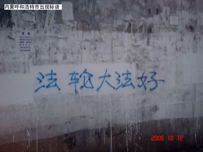 ![]() 内蒙古呼和浩特市的“天灭中共”标语 | ![]() 内蒙古呼和浩特市的“法轮大法好”标语 |