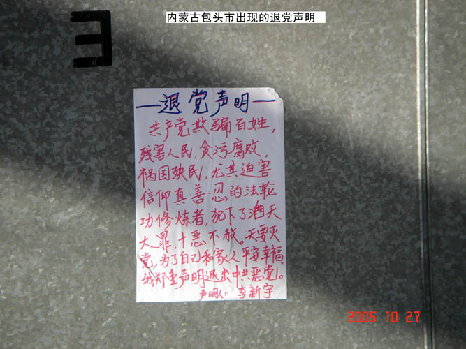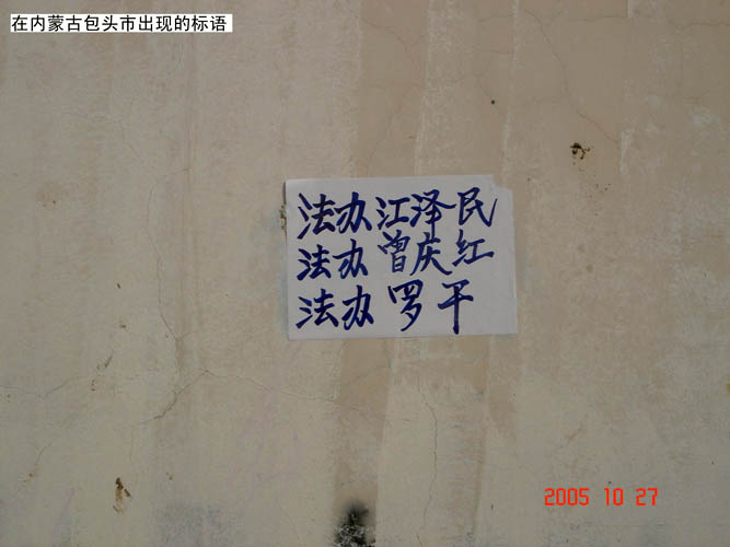 ![]() 内蒙古包头市的“法办元凶”标语 | ![]() 内蒙古包头市出现的退!党!声明 |