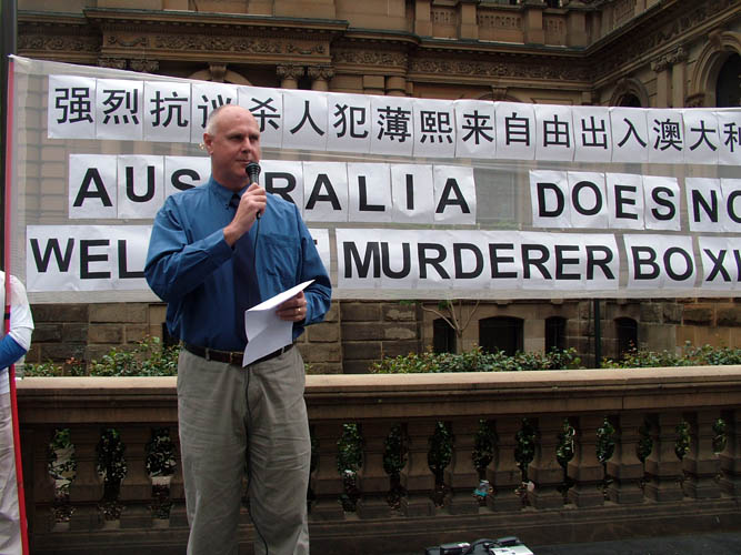 纽省法轮大法学会会长约翰•戴乐在发言中表示,今年三月三十一日澳洲法轮功学员潘宇以反人类罪和群体灭绝罪将人权恶棍薄熙来告上纽省高等法院。薄熙来自一九九九年七月二十日中共迫害法轮功以来积极追随江氏集团迫害法轮功修炼团体,特别是他在任辽宁省长期间(二零零一年至二零零四年)专门为转化大量的法轮功学员花巨资筹建大型监狱设施,其中以残酷、血腥而著称的马三家劳教所一地就耗资了五亿多元,使辽宁省成为迫害法轮功最严重的省份之一。明慧网详细资料显示至二零零三年在薄熙来的授意下,九十名无辜的法轮功学员被迫害致死。潘宇也在薄熙来任辽宁省长期间遭受酷刑折磨,包括四万伏高压电击。