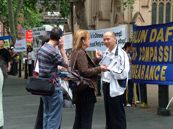 ![]() 法轮功学员的抗议活动引起路人关注 |
