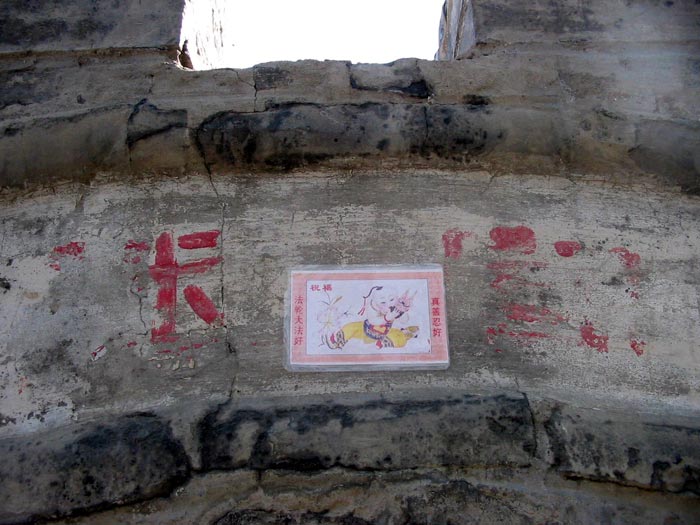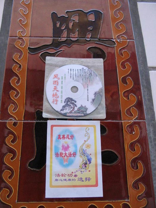 ![]() 山西忻州奇村一村民住宅大门上张贴的光盘《风雨天地行》和不干胶“法轮大法好” |