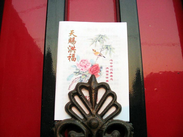 ![]() 山西忻州奇村一村民住宅大门上放着小册子《天赐洪福》,供村民了解真相 |