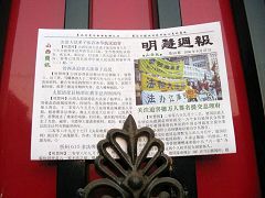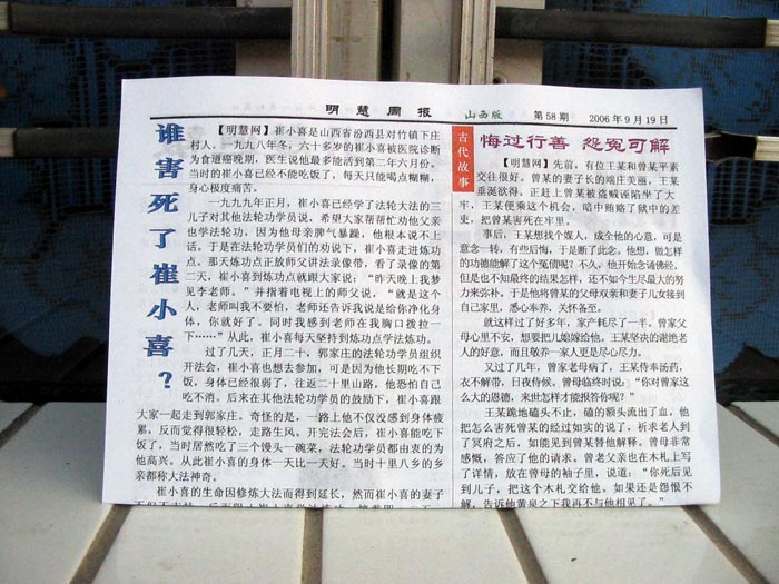 ![]() 山西忻州奇村一村民住宅大门上放着传单《明慧周报》山西版,供村民了解真相 |