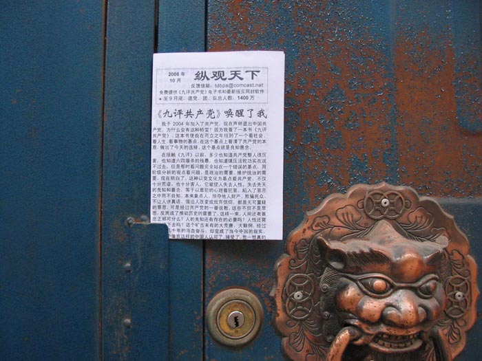 ![]() 山西忻州奇村一村民住宅大门上放着传单《纵观天下》,供村民了解真相 |