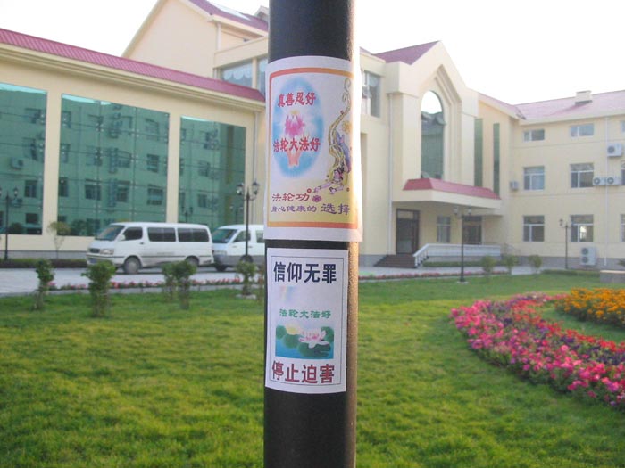 ![]() 山西朔州市中心广场柱子上张贴的标语“法轮大法是正法” |