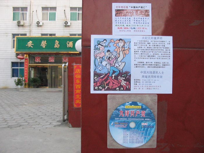 ![]() 山西忻州奇村安馨岛酒店门口张贴的不干胶“亿年奇石报‘中国共产党亡’”、《大.纪.元;郑重声明》和光盘《·九·评*共产党》,供有缘人了解真相 |