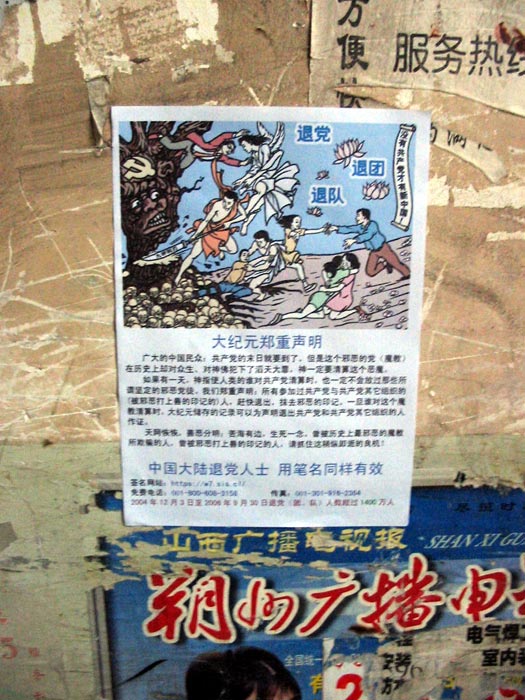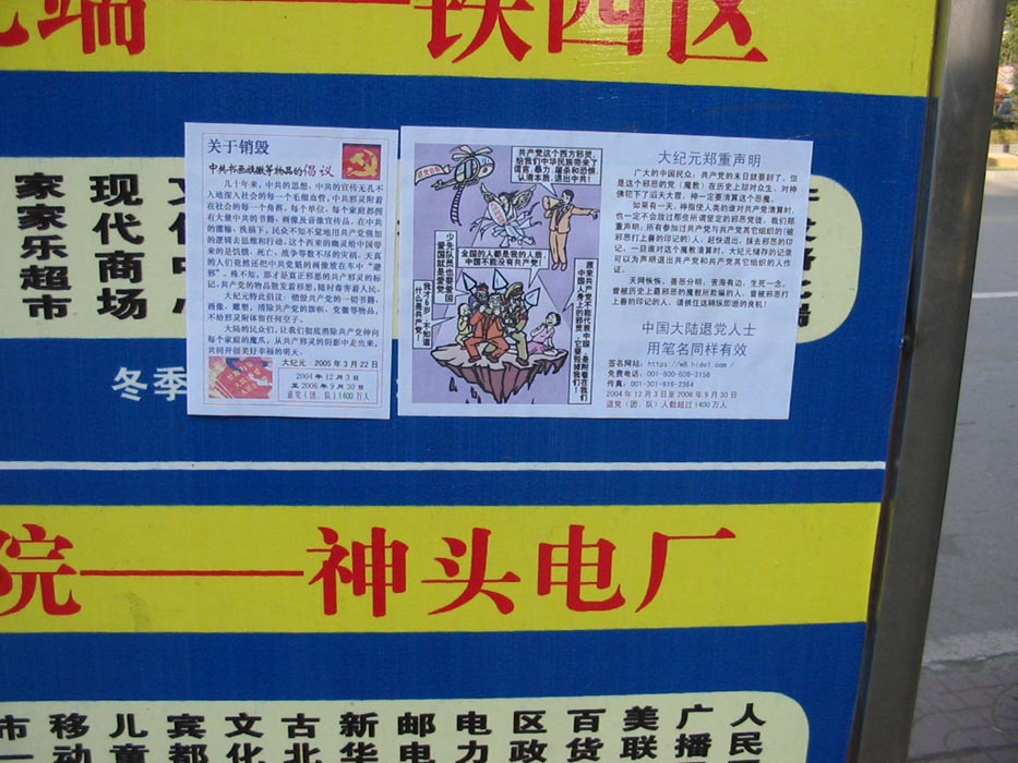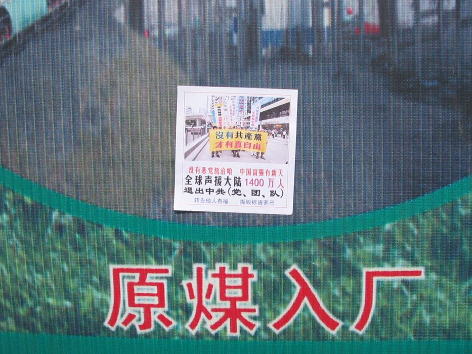 ![]() 山西朔州开发北路公共汽车站张贴的不干胶《大.纪.元;郑重声明》 和《关于销毁中共书画旗徽等物品的倡议》,一些等车的人观看后了解了真相 |