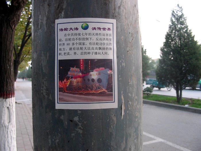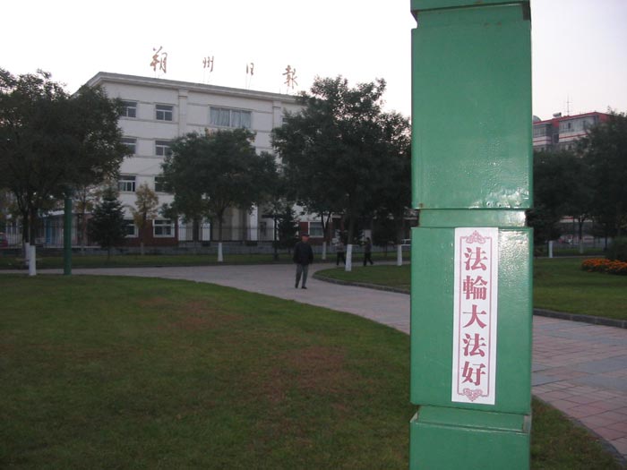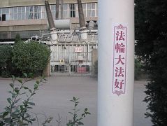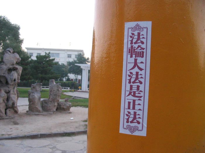 ![]() 山西朔州市中心广场柱子上张贴的标语“法轮大法好” |