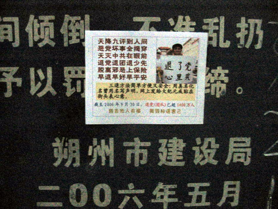 ![]() 山西朔州市政府对面广告栏上张贴的不干胶“·九·评*奇书灭邪*党-” |