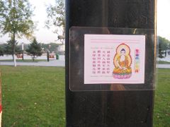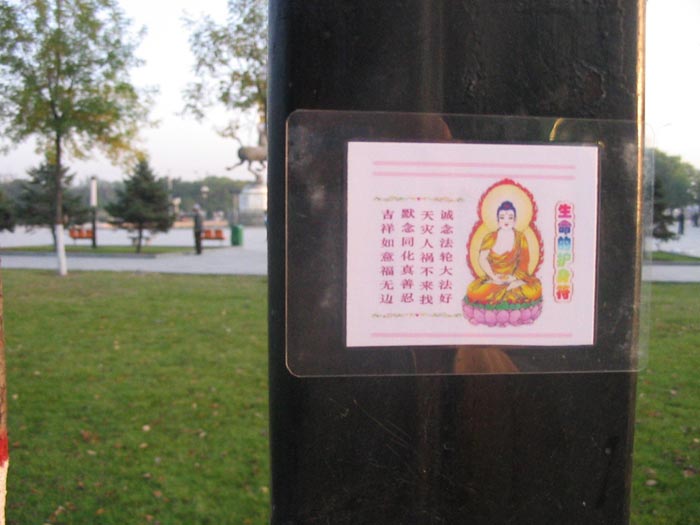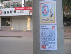 ![]() 山西朔州中心广场电线杆上张贴的护身符,供有缘人拿取 |
