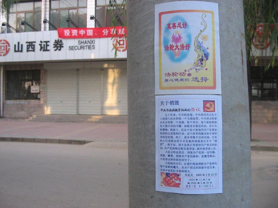 ![]() 山西朔州一小巷张贴的不干胶“法轮大法好”和《关于销毁中共书画旗徽等物品的倡议》 |