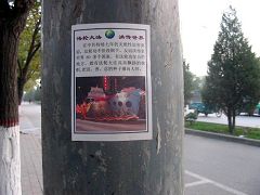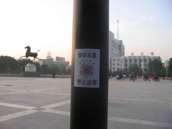 ![]() 山西朔州中心广场电线杆上张贴的不干胶“信仰无罪 停止迫害” |