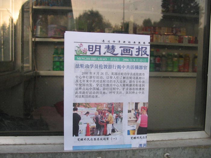 ![]() 山西朔州一商店橱窗上放着传单《明慧画报》,有缘人拿取了解真相 |