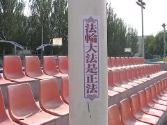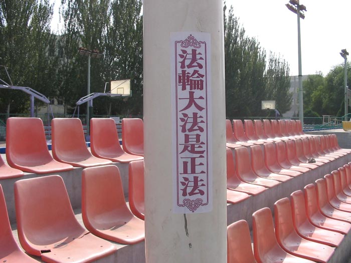 ![]() 山西朔州平朔公园运动场张贴的不干胶“法轮大法洪传世界” |
