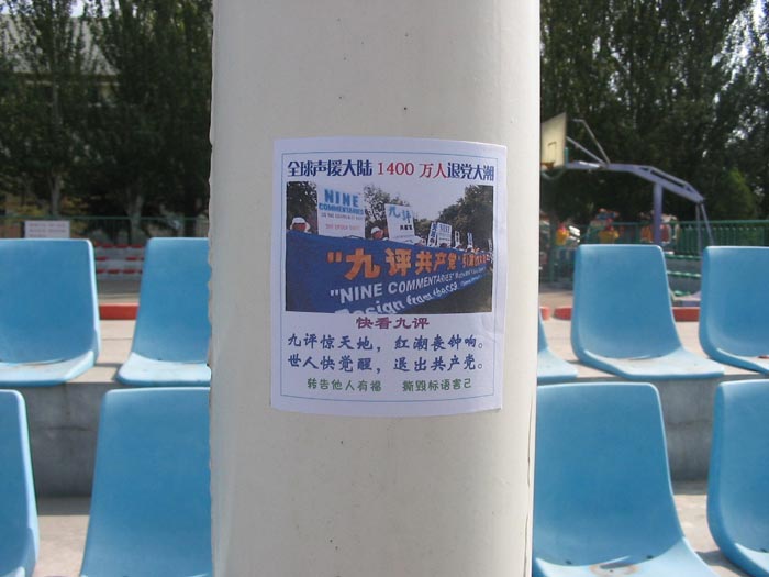 ![]() 山西朔州平朔公园运动场张贴的不干胶“全球声援大陆1400万退!党!大潮” |