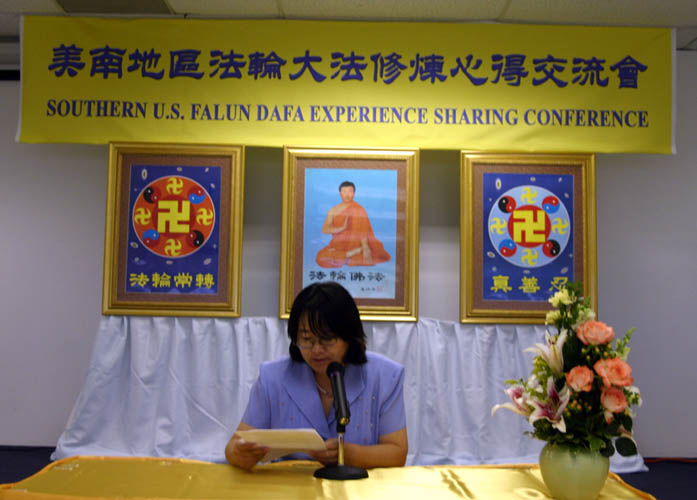 交流会上有十六位同修发言。休斯顿学员曾女士发言说:师父来美传法十周年,我修炼也有十年了,当时知道大法好,一路坎坷走来,修炼的决心越来越大。在修炼过程中,我知道学法太重要了,但是干扰也很大。我看到明慧网有介绍同修背法体会的文章之后,我开始背法,第一遍很困难,现在已经背完一遍了,又开始背第二遍,就没有那么困难了,我有时间就学法。从二零零四年开始,我开始去中领馆讲真相,那个时候,有工作上的干扰还有家庭的干扰,但我坚持学法,从魔难中走了出来,稳健的走好以后的路。
