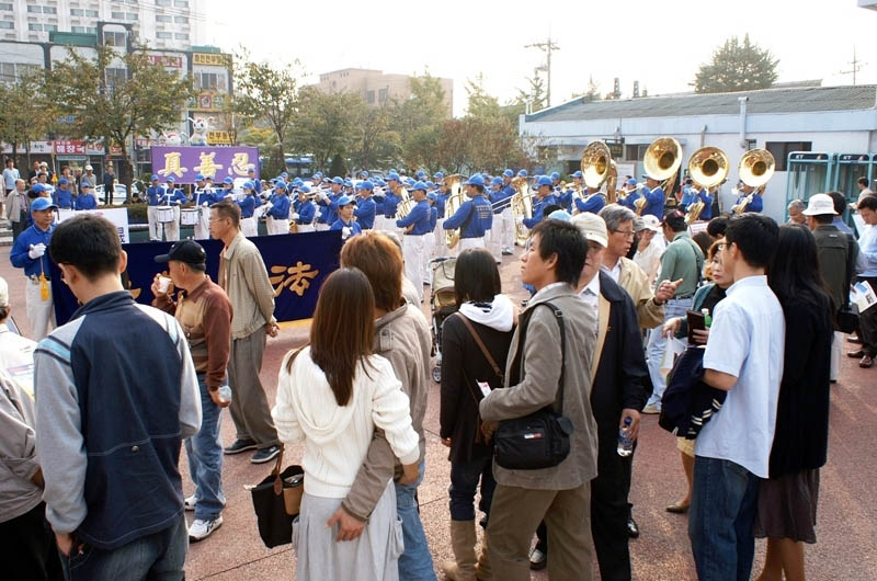 观众们被“天国乐团”整齐威严的阵势和优美的演奏深深震撼,有人认真看着真相展板,有人详细读着真相资料,有的在营救受迫害法轮功学员、谴责中共活摘法轮功学员器官的征签表上签名;有的华人当场声明退出中共恶党的相关组织。
