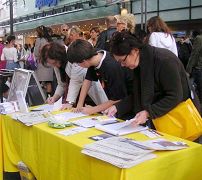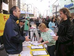 一对中国留学生从学员们的展台前走过,那男孩子站在不远的街上,遥遥观望着。学员送给他中文的材料,他点头收下了。当提到中共对法轮功的迫害及现在的退!党!大潮时,他说,他看了BBC对中国盗卖人体器官的报道,他现在要自己了解一下,好好想一想。