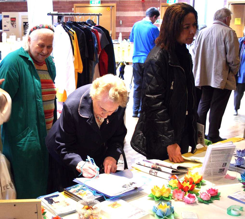十四日下午,展览会的主办者给法轮功学员提供了一个教功的场所,让有兴趣学习法轮功的人们可以感受一下,法轮功学员简单介绍了一下法轮功并教炼了几个动作,人人都感觉到很强的能量。其后一位女士说,“今天遇到法轮功太好了。几年前我出游到西班牙,有一天早晨我出去散步,那时太阳刚要升起,我看见几十个人沐浴在晨曦中,他们正炼着法轮功,哦,那景象太美了,绝对是超尘脱俗的,可惜那天我必须得离开。请给我你们的联系方式,我一定要学。非常谢谢你们。”