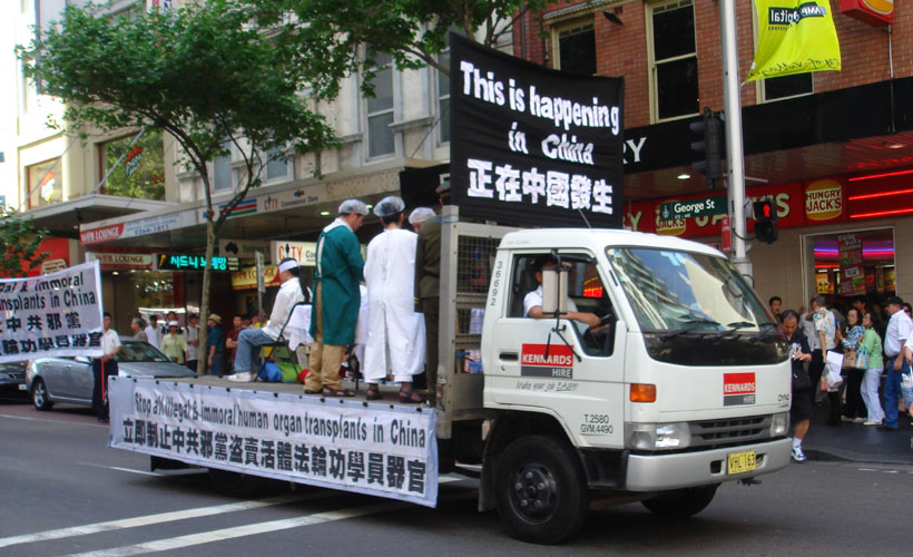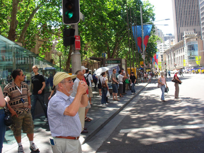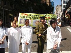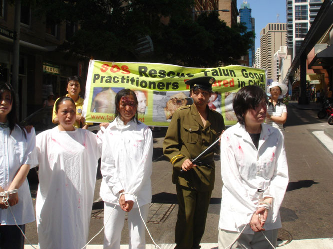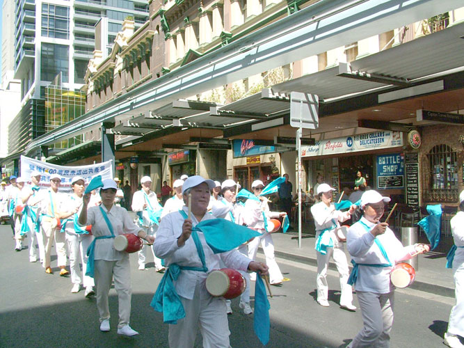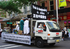 在警察的保护和警车开道下,游行队伍浩浩荡荡,犹如旋风一路吸引并震撼了无数悉尼民众,特别是披露中共活体摘取法轮功学员器官牟利的真人反酷刑展所到之处都令目睹者感到震惊。很多随身带相机的路人纷纷按下快门记录这特殊的历史镜头,尤其是华人游客,将游行队伍作为自己的背景拍照留念。