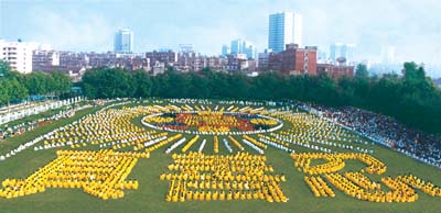 ![]() 李洪志师父在武汉共举办过五期法轮功传授班。法轮功备受武汉人民喜爱。武汉学员曾多次举办大型的集体炼功活动,场面之宏大震撼人心。这是由五千多法轮功学员集体炼功,列队组字。(一九九七年) |