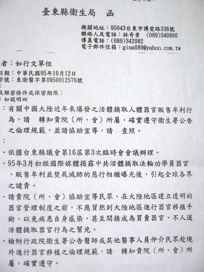 依据议会决议事项,台东县政府卫生局已于十月十二日正式行文各相关单位,包括台东县各公私立医院、乡镇市卫生所、医师公会等,说明中共活摘器官已引起全球谴责,要求协助宣导民众,不应贸然赴大陆进行器官移植,以免自身受害又间接成为中共反人道行为的帮凶。