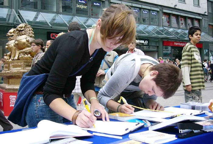 还有一个小伙子,他在征签表上签了名后告诉学员,“我两星期前刚去过北京,我喜欢中国,那里的人民也应该过的好,所以我签了字(反对迫害)。”(德文原声录音(MP3))