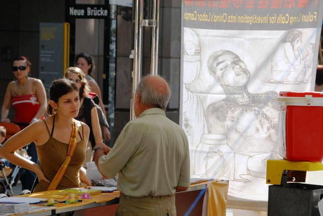 学员在搭建“信息展”方面已经十分有经验了,于是在很短的时间内一个结构合理美观的“信息展”建好了,展位前还设置了三张轻便又易于装卸的桌子,以便人们能够签名反迫害。