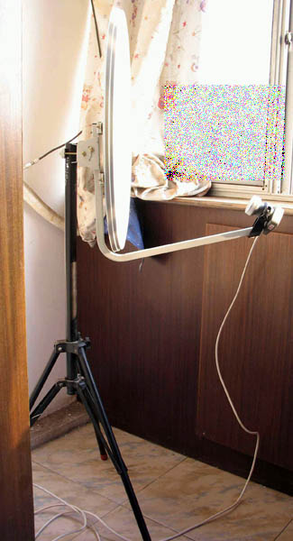 1、 先准备一个可调整高度,便于移动的支架,可用摄影用的三角架改装。(图一,图示是中卫60cmKU天线。此架支撑中卫75cmKU天线很稳。)当然也可以用两截钢管和厚钢板焊接一个,稳定性会更好。
