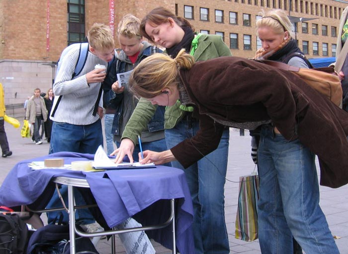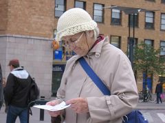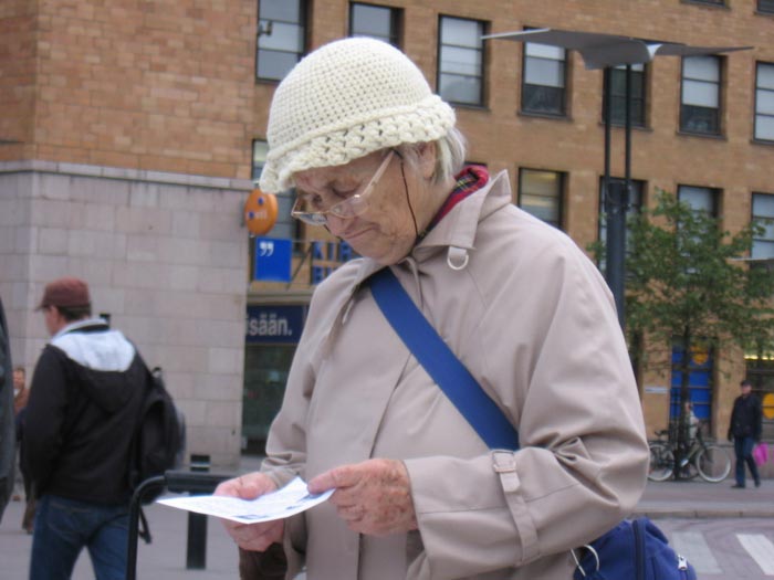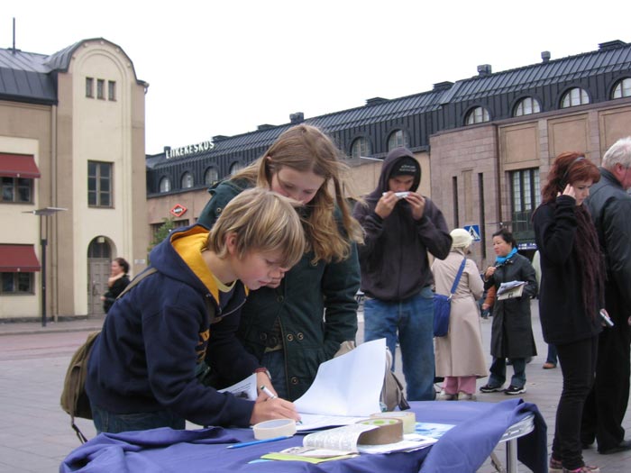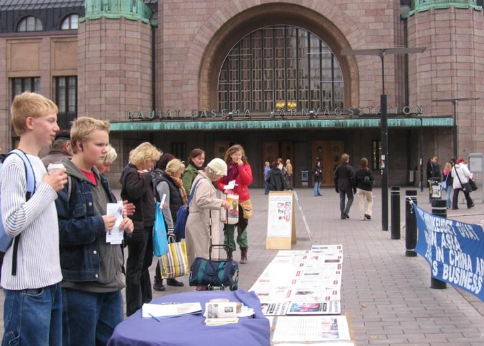 ![]() 法轮功学员在赫尔辛基火车站一侧多次举办讲真相活动,每次都吸引很多人来了解详情 |
