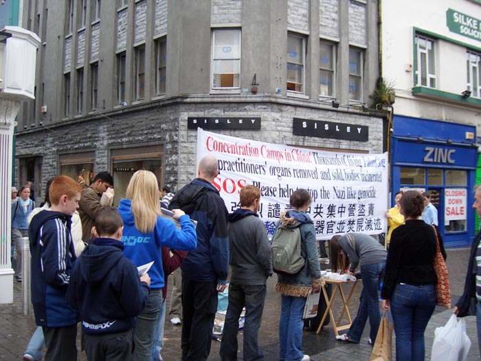下午学员们又来到了高威(Galway)的步行街,揭露中共非法活体摘取法轮功学员器官的暴行。活动得到了当地民众的热心支持,学员刚把横幅展现出来,在街上匆忙的民众就都被横幅上的内容所震惊。由于桌子很小,只放了一个征签本,但明白真相的人们纷纷走来,并且秩序井然的排着长队等候签名来谴责这场惨无人道的迫害。