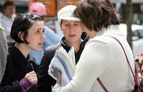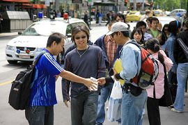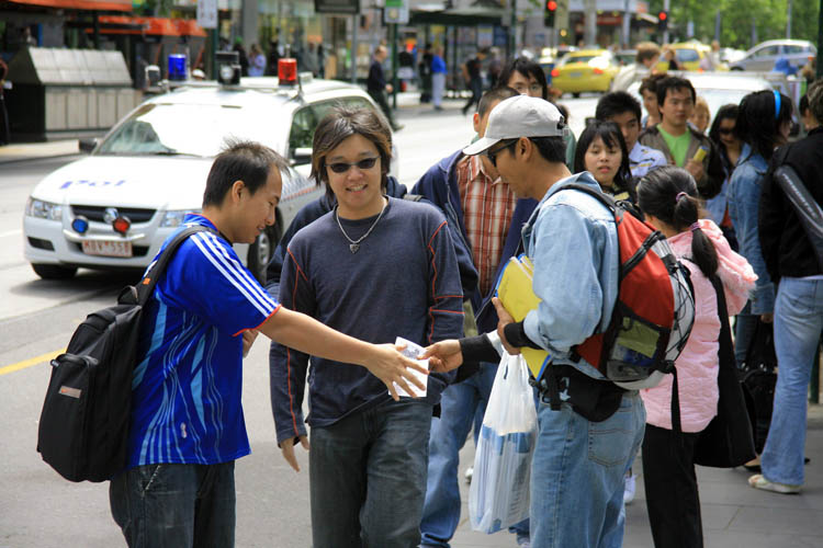 ![]() 学生们在维省图书馆前纷纷接过传单。 |