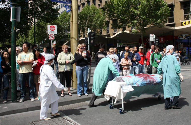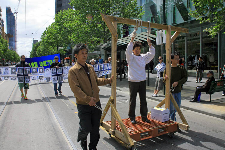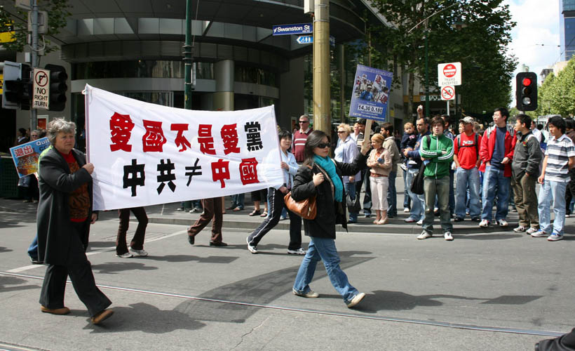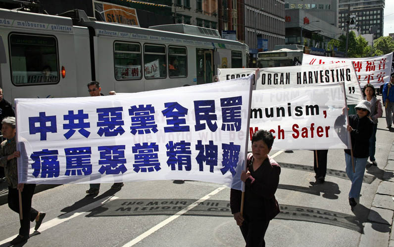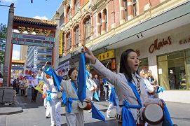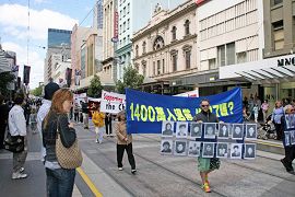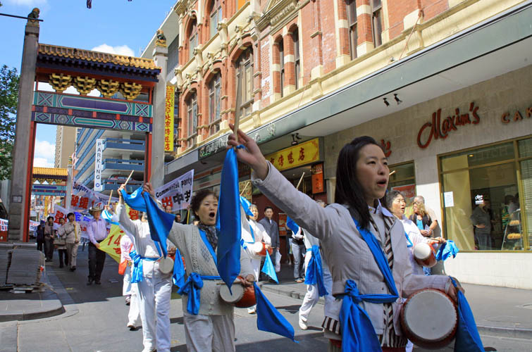 这一天,墨尔本气温骤降,疾风猛吹,游行民众腰鼓阵打头,扛着“天灭中共”、“广传·九·评*,退出邪*党-”等大型横幅在风中阔步前行,格外引人瞩目。游行队伍用中英文高喊“没有共产党,才有新中国”,“退!党!退!党!快退!党!”,“No More CCP”“制止虐杀”等口号。沿途,不时有民众驻足街头,长时间鼓掌致意。一位六十多岁的女士,在观看游行并阅读了揭露中共活摘法轮功学员器官的传单后,当场失声痛哭,她说“我是来自匈牙利的移民。我父亲在1957年的事件中被共产党杀害。虽然过去的事已经过去,现在身处自由的国度,可是那种痛苦伴随你一生,永远忘不了。活摘器官的事,我知道他们干得出来。你们做的事是对的。”