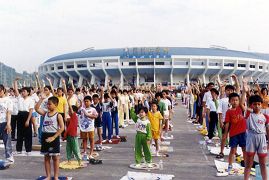 历史图片:广东省电白县九九年四二五前集体炼功一角