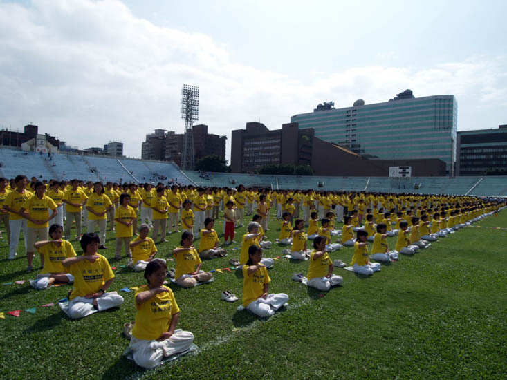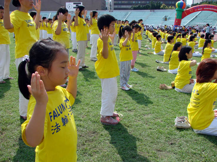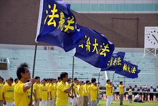 当天早上风和日丽、艳阳高照,与会嘉宾、立委、团体、与台北市民们络绎不绝。运动大会一开始,便由气势磅礴的“新!唐!人:旗鼓队”开场,只听威武雄壮的鼓声震撼天宇,只见壮丽飞扬的旌旗扫荡阴霾,在场来宾不禁专注观赏并不时给予热烈掌声。法轮功学员的五套功法表演则担任运动团体的压轴演出,在等待的期间,即便是烈日当头,学员们也安静、整齐的等待表演开始。