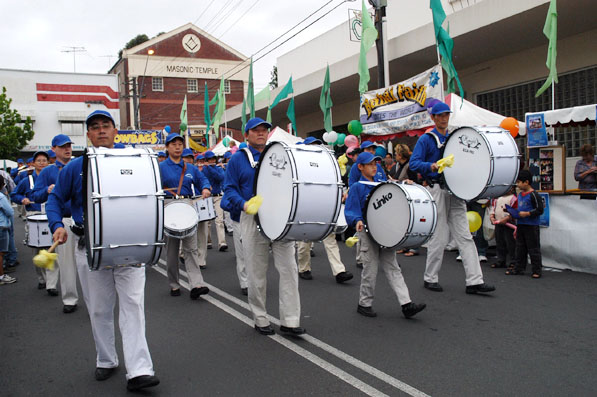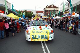 上午十时游行开始,由当地Ryde议会的Granny Smith青苹果大彩车领队,紧接着是不同民族社区的游行队伍。悉尼法轮功团体也应邀参加,当由法轮功学员组成的天国乐团出现时,公路两边的观众都非常惊奇的注视着这支由东西方人组成的乐队,他们服装整齐,演奏的音乐还是第一次听到,非常动听。