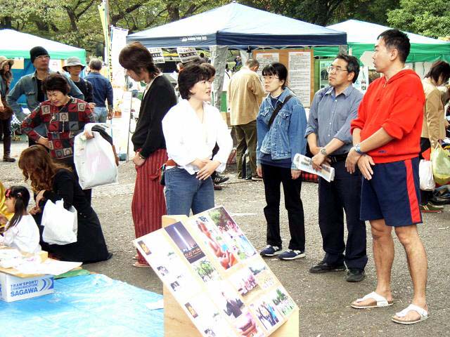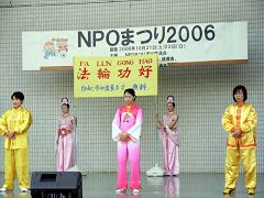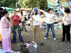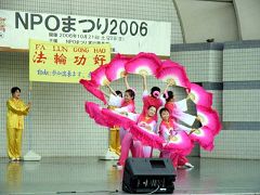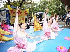 在法轮功教功场地,“唐韵艺术团”的法轮功学员把功法展示和富有神韵的“花仙舞”穿插起来表演,并由唐装仙女配以日文解说,吸引了众多游客学炼法轮功。有两位观看的日本舞蹈演员对“花仙舞”很感兴趣,也加入花仙的行列一起跳了起来,越跳兴致越高,最后她们向法轮功学员学炼了功法。还有一位是来自日本福岛的女士,一直在学炼功法,似乎,她就是为了得法而特意来到了东京……还有的游客原来对法轮功带有不正确的认识,一开始不肯接受法轮功介绍资料,可后来又被美妙的舞姿吸引了回来,瞪大了眼睛驻足观赏舞蹈和功法表演。