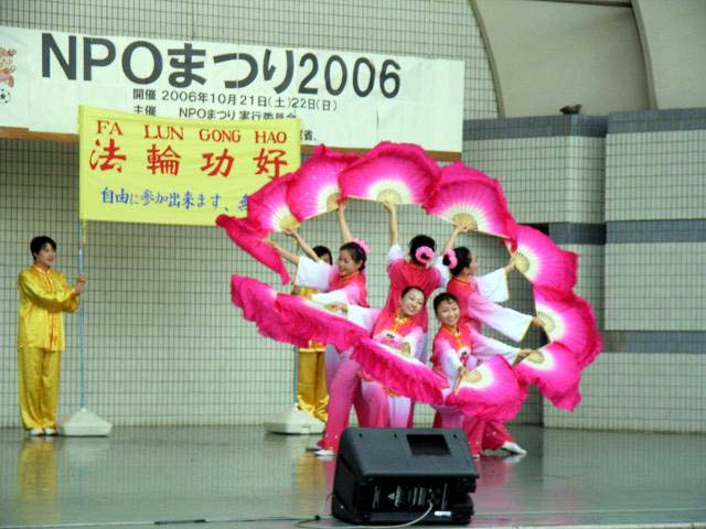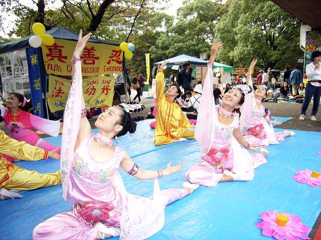由法轮功学员组成的“日本唐韵艺术团”,在节日主席台上以“法轮功好”4个大字为背景,为观众展示了法轮功功法,还表演了中国民族舞蹈“扇子舞”、富有古唐神韵的“花仙舞”,并演唱了“为你而来”等法轮功学员创作的歌曲,博得了观众的热烈掌声。观众们欣喜的接受了学员们发放的法轮功介绍资料。一名来自西方的黑人学者,一边在台下拍摄学员们演出和炼功的照片,一边听学员讲述了法轮功在大陆遭受的迫害。他表示会把真相告诉给更多的人。